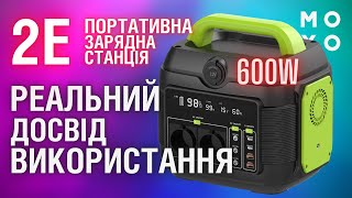 Компактная модель в крепко сбитом корпусе со слегка выпирающей ручкой для переноски. В 6.1-килограммовый корпус зарядной станции упаковали аккумуляторную батарею типа Li-Ion общей ёмкостью 576 Вт*ч. Силёнок у электростанции хватает на продолжительное питание нагрузки мощностью до 600 Вт. Также 2E 2E-OPS-600 выдерживает краткие импульсные скачки мощности до уровня 1000 Вт. На лицевую панель станции вынесены две розетки 230 В, обеспечивающие чистую синусоиду переменного тока на выходе.