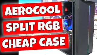 Внутреннее пространство платформы представлено единой камерой, без разделения на секции. Блок питания крепится в верхней части. Корпус Aerocool Split имеет на лицевой панели эффектную RGB-подсветку с 13 различными режимами работы, для переключения между которыми предусмотрена выделенная кнопка. Штатное охлаждение представлено одной лопастной крыльчаткой на 120 мм. Эффективность воздушного охлаждения повышается за счет вентканалов по периметру лицевой панели. В корпусе предусмотрено четыре посадочных места для накопителей памяти (два HDD 3,5" и столько же SSD 2,5"). Под карты расширения PCI предусмотрено семь горизонтальных заглушек. Одна из боковин системного блока изготовлена из акрила, но данный корпус можно найти и в модификации с закаленным стеклом — модель с боковой стеклянной панелью называется Split Tempered Glass.