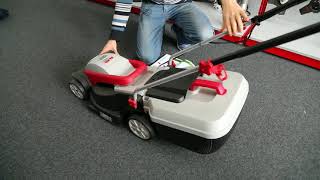 Электрическая газонокосилка, прежде всего предназначенная для ухода за участками площадью около 500 кв.м. Ширина области скашивания составляет 38 см, высота регулируется в пределах от 2 до 6 см, но для этого пользователю придётся перекручивать каждое колесо в отдельности. Система выброса скошенной травы исключительно классическая – в специальный жёсткий мешок ёмкостью 37 литров. Мощность двигателя составляет 1400 Вт, есть система защиты от перегрева. Колеса не выступают за линию корпуса.