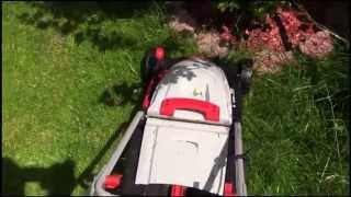 Растительность, скошенная острым ножом, выбрасывается назад — прямо в емкость для сбора травы, которая сделана из пластика и имеет объем 37 л. На травосборнике есть индикатор, позволяющий следить за заполнением ящика, не нагибаясь к косилке. Можно косить и без травосборника (с приподнятой задней крышкой) — в таком случае трава , мелко-мелко покрошенная острым ножом, разбрасывается позади косилки.