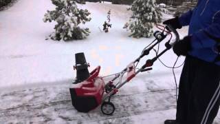 За одну проходку снегоуборщик очищает от снега полосу шириной 46 см. Высота снежной шапки при этом может достигать 30 см. Собранный шнеком снег отбрасывается через поворотный в пределах 180° желоб, положение которого изменяется путем вращения отдельной ручки с фиксатором. Не поддается регулировке лишь высота выброса, но это модели простительно.