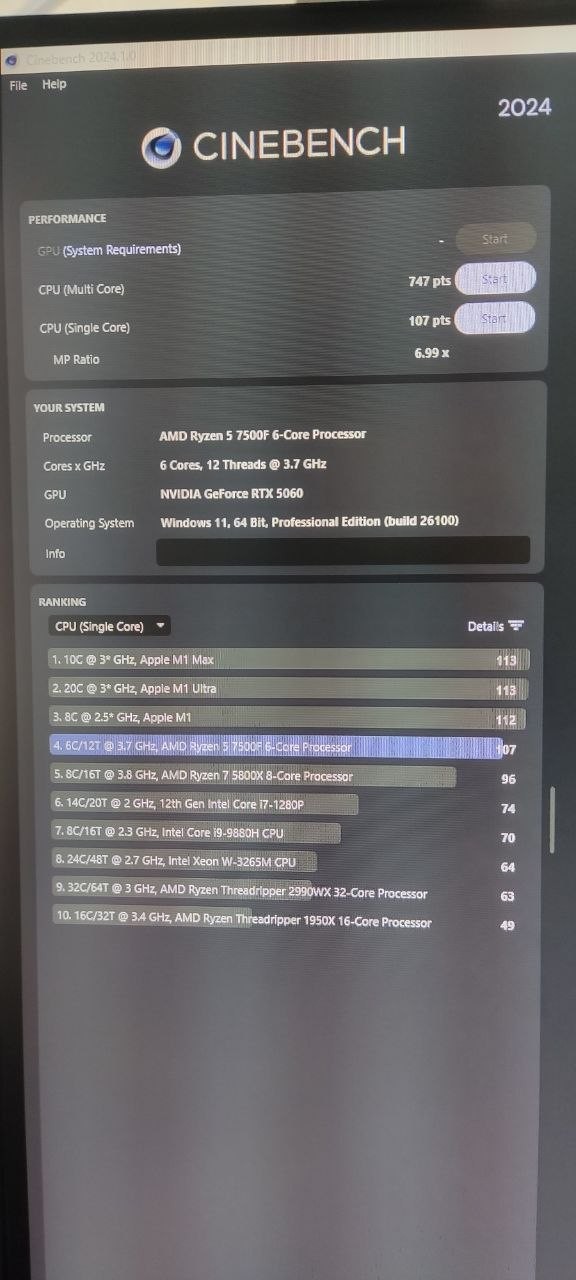 Добротный процессор, с которым стоит входить в АМ5. По производительности обходит прожорливый AM4 (или временами равен ему), но стоит намного дешевле и с перспективой долгой жизни на АМ5. Камень достаточно горячий, нужно подбирать хорошую воздушку с качественной термопастой. В паре с Frozn A410 и комплектной пастой в стрессе доходит до 78 С (в стоке, без андервольта и курвы). Брал в связке с 5060 что считается идеальным сочетанием. Результаты тестов на фото; на лоу-пресетах в той же кс2, к примеру, может достигать 700+ к/с, в соревновательных режимах стабильно 400+ - цена (идеальный кандидат при переходе с АМ4 или интелов пред. поколений)