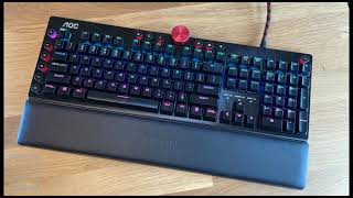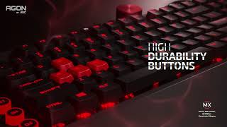 Full-версия механической геймерской клавиатуры GK, представленная на рынке брендом AOC и позиционируемый в верхний ценовой диапазон. Модификация AGK700 комплектуется съемной подставкой под запястья с мягкой кожаной отделкой. Левый край раскладки оснащен шестью дополнительными клавишами, которые предназначены для программирования макрокоманд. Сверху предусмотрено массивное колесико регулировки громкости и семь кнопок быстрого доступа.