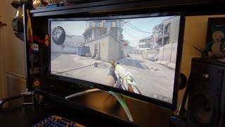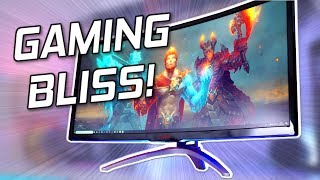 Игровой сверхширокоэкранный монитор с крупный 35-дюймовым экраном UltraWQHD-разрешения и поддержкой технологии NVIDIA G-Sync. Имеет внушительную стоимость, но является один из самых доступных решений такого класса. Экран размерами 82х35 см выполнен на основе полноценной 8-и битной AMVA-матрицы с разрешением 3440х1440 и WhiteLED-подсветкой. Для модуляции яркости экрана не используется широтно-импульсная модуляция, вызывающая усталость глаз.