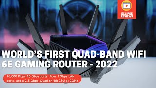 Одна из топовых моделей высокопроизводительных беспроводных роутеров геймерской серии Asus Republic of Gamers. Относится к маршрутизаторам класса AX16000 с поддержкой стандарта Wi-Fi 6E (802.11n/ac/ax), который способен обеспечить сверхбыструю передачу данных с минимальными задержками (2 мс) для комфортного гейминга в любых динамичных игровых проектах и киберспортивных дисциплинах.