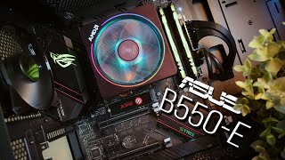 Материнская плата Asus ROG STRIX B550-E GAMING гарантированно совместима с процессорами Ryzen 3/5/7/9 3000 (ядра Matisse и Matisse Refresh, 7 нм) и гибридными процессорами Ryzen 4000 (ядро Renoir, 7 нм). Позиционируется как продукт верхней ценовой категории, предназначенный для создания высокопроизводительных оверклокерских и геймерских конфигураций. Оборудована мощной 16-фазной (14+2) подсистемой питания процессора c большими радиаторами.