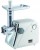 При пиковых нагрузках показатель мощности достигает значения в 2000 Вт. Скоростной режим всего один, но зато есть функция реверса, когда шнек движется в обратном направлении, выталкивая застрявшие куски продуктов, жилы и кости. Электромясорубка получила основание из прочной нержавеющей стали и металлическую камеру измельчения, а также оснащена прорезиненными ножками для устойчивости, вместительным металлическим загрузочным лотком и толкателем.