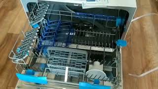 Одновременно при помощи машины можно вымыть до 6 комплектов посуды, а специальные индикаторы на панели сообщат о наличии соли или ополаскивателей в воде. Производителем предусмотрена возможность использования специальных моющих «таблеток», которые изначально содержат в себе необходимое количество моющего средства, соли для смягчения жесткой воды и ополаскивателя. Устройство рассчитано на настольную установку, ширина корпуса составляет 55 см.