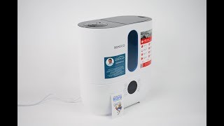 Увлажнитель Boneco U350 может работать в режиме подачи холодного и теплого пара. Для снижения уровня шума, источниками которого являются ультразвуковой излучатель и вентилятор, нагнетающий воздух для выноса пара, предусмотрено три уровня рабочей мощности. Для предотвращения образования налета на предметах окружающей обстановки, прибор оборудован ионообменным фильтром картриджного типа, а за антибактериальную обработку воды отвечает специальный антибактериальный серебряный стержень Ionic Silver Stick. Включение и выключение увлажнителя может выполняться по программируемому таймеру. Есть индикация низкого уровня воды и предупреждение о необходимости ручной очистки.