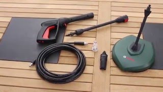 Компактное и легкое (5,53 кг) устройство комплектуется минимальным набором насадок и приспособлений на быстросъемных байонетных соединениях: 5-метровый шланг высокого давления, моющий пистолет с удлинительной трубкой, тройная насадка для регулировки силы и формы струи (веерный и точечный режимы, низкое давление), а также водяной фильтр. Все съемные части устройства для транспортировки можно зафиксировать на корпусе минимойки, а шланг высокого давления – в специальных пазах на складывающейся ручке.