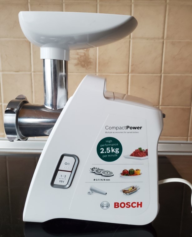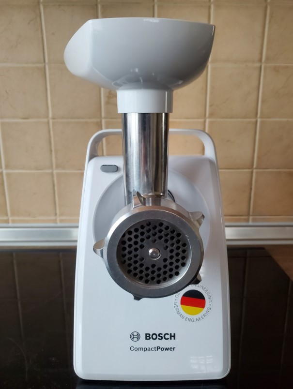 Небольшая, но мощная электрическая мясорубка от популярного немецкого производителя бытовой техники — компании Bosch. Это достаточно многофункциональная модель среднего ценового диапазона, которая может послужить отличным выбором для бытовой эксплуатации. Пиковая мощность работы составляет 2000 Вт, при этом аппарат всего за одну минуту позволяет производить до 2,5 кг фарша. Производитель оснастил прибор целым набором насадок: в комплекте идут 3 перфорированных диска для фарша (с крупными, мелкими и средними отверстиями), насадка для кеббе и для домашних колбас.