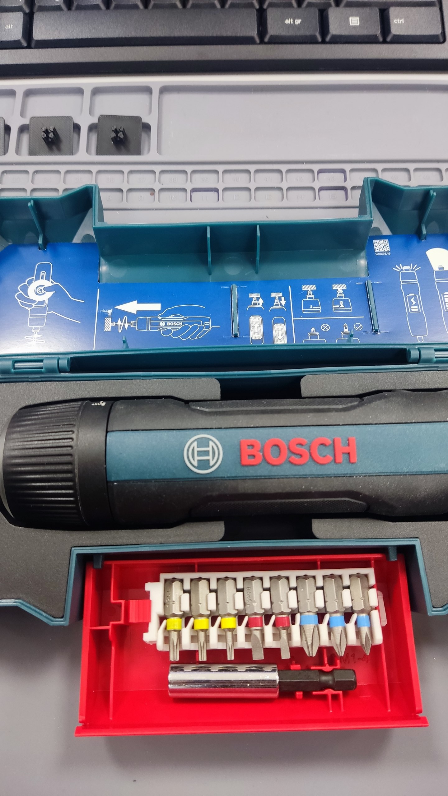 Патрон имеет шестигранное отверстие под стандартные биты. Он окружен кольцевой светодиодной подсветкой, которая освещает большую площадь, облегчая работу в темных углах. Встроенный аккумулятор, имеющий емкость 2 Ач, заряжается через разъем USB C. К отвертке прилагаются кабель для зарядки, набор из 8 бит наиболее востребованных видов и типоразмеров, адаптер-удлинитель и небольшой пластиковый кейс для хранения инструмента вместе со всеми перечисленными аксессуарами и принадлежностями.