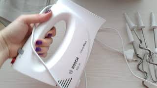 Недорогой ручной миксер от небезызвестной компании Bosch. Комплектуется базовой насадкой для взбивания разных жидкостей и жидких продуктов, а также отдельно — крючками для замеса густого теста. Смена насадки возможна только при выключенном приборе, для замены реализована специальная кнопка. Предусмотрено только 2 скорости вращения насадки, не считая кнопки "турбо" для повышения мощности на короткий срок. Корпус выполнен из ударопрочного пластика.