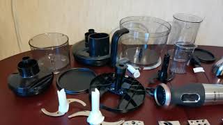 Блендер Bosch MS8CM6190 комплектуется большой чашей-комбайном объемом 1,25 л с различными принадлежностями (четыре стальных насадки для нарезки/шинковки и S-образный пластиковый крюк для быстрого замешивания теста). Кроме этого имеется чаша универсального мини-измельчителя объемом 0,45 л для измельчения зелени, сыра, орехов, лука, мяса и других продуктов (с отдельной крышкой).