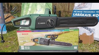 Относительно простая пила среднего класса мощности (1.8 кВт), предназначенная для бытового применения. С ее помощью целесообразно выполнять несложные работы, вроде обрезания ненужных веток на деревьях в саду, заготовки дров (в небольших объемах) или распила деревянных заготовок (до 300 мм в поперечнике). Электрическая цепная пила Bosch UniversalChain 35 весит меньше, чем бензиновые аналоги (ее вес составляет 4.2 кг) и проще в обслуживании. Она оснащена системой автосмазки (пользователь лишь время от времени подливает масло в бачок), а для регулировки натяжения цепи и замены полотна не нужны ключи с отвертками. На пиле установлены 350-миллиметровая шина и цепь от компании Oregon — одного из самых авторитетных производителей пильной гарнитуры.