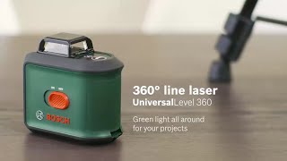 Лазерный нивелир бытового класса, предназначенный для использования в помещениях. Может проецировать горизонтальную плоскость на 360° и одну вертикальную линию с углом развертки 120°. Линии проецируются на расстояние до 12 метров. Благодаря зеленому лазеру они хорошо видны при ярком дневном или искусственном освещении. Лазерный нивелир Bosch UniversalLevel 360 на одном комплекте батареек может проработать не менее 4 часов (время работы зависит от количества включенных проекций). Его можно устанавливать на штатив (внизу на корпусе есть соответствующее резьбовое отверстие), но сама тренога в комплекте не идет. К устройству прилагаются батарейки и мягкий чехол с креплением под поясной ремень.