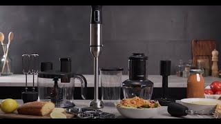 Кроме того, удлиненная ножка XL дает возможность готовить в высоких стаканах и больших емкостях. Модель также выполняет роль кухонной машины, так как комплектуется вместительной чашей объемом 1.5 л и мини-измельчителем на 600 мл. Вы можете использовать обычный венчик, двойной венчик, которые смешивают и взбивают крем, жидкое тесто и другие не слишком густые массы, специальную насадку для приготовления пюре и диски для нарезки и шинковки.
