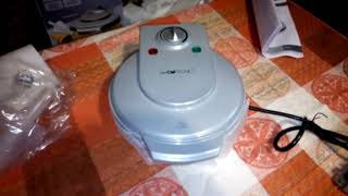 Верный кухонный помощник в приготовлении хрустящих вафель оборудован круглой жарочной поверхностью диаметром 18 см. Пластины с антипригарным покрытием являются съёмными, что упрощает задачи по их очистке от загрязнений по окончанию процедуры готовки. Модель примечательна оснащённостью термостатом для плавной регулировки температуры нагрева пластин. Он расположился на поверхности крышки Clatronic HA 3494, а слева и справа от механической «крутилки» находятся световые индикаторы питания и нагрева соответственно.