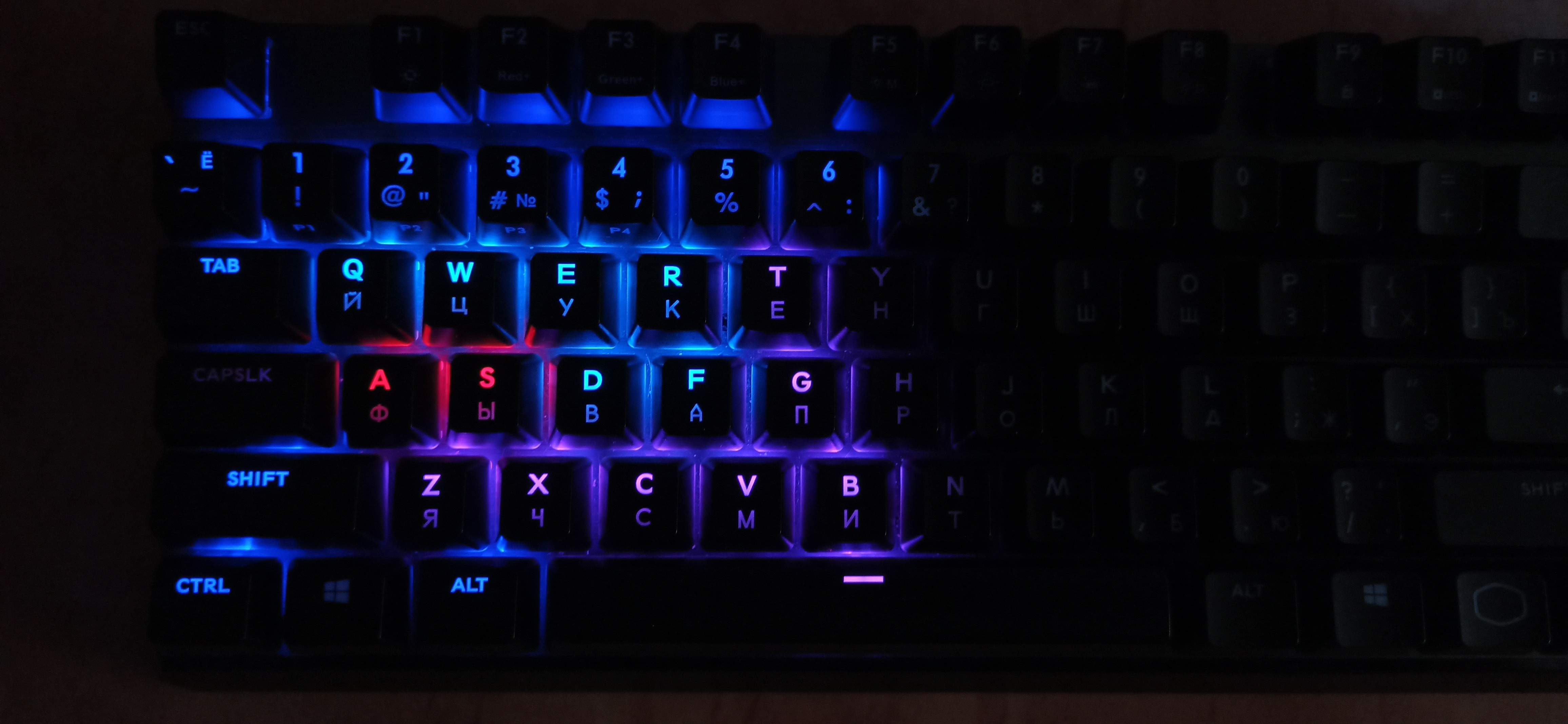 ⊖ Довольно сильно звенит металлическая пластина при отжатии клавиш - потребуется установка дополнительной шумоизоляции путём вставки под плиту поролоноподобного материала (БиПласт). Делать это будет целесообразно по истечению гарантийного срока. Перед покупкой в магазине можете проверить звон резко отжимая кнопки: R-Alt, / , R-Ctrl, F3, F11, F12, Insert, , NUM-5, FN, NUM-DEL, NUM-1 и другие. ⊖ Я бы предпочёл, если бы на кейкапах не было пометок о дополнительном функционале вообще (макро кнопки, настройка подсветки). Настраивать всё это всё равно раз в год можно через программу или пару раз подсмотреть в руководство, зато постоянно на клавишах есть этот визуальный мусор маленьким шрифтом. ⊖ Не хватает, пожалуй, пары кнопок для управления громкостью или колёсика. ⊖ Меня корёжит от начертания кириллической А,Й,Ч. И зачем-то перевернули местами символы 1 и ! . |