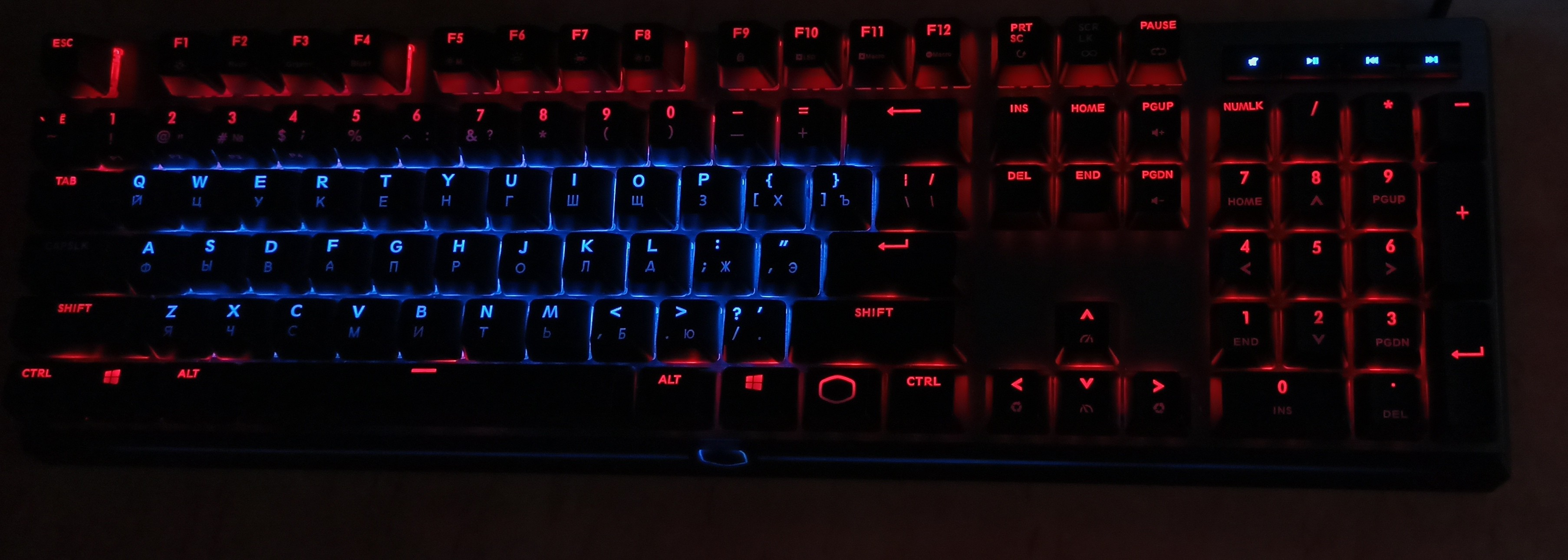 ⊕ Лаконичный и строгий дизайн. ⊕ Подставка под руки в комплекте (понял что без неё лучше, чем с ней - не использую вообще). ⊕ Cherry RED оптимальный выбор для большинства задач. ⊕ FullRGB подсветка с 5 профилями подсветки и макросов, и всё это можно настроить как в спец-программе, так и на лету посредством комбинаций на самой клавиатуре (естественно я не использую весь этот мусор). ⊕ Возможность блокировать WIN кнопку, возможность блокировать ВСЮ клавиатуру (супер удобно когда надо протереть). ⊕ Доп медиа-клавиши плеера. ⊕ Хорошие материалы. ⊕ Заменяемый кабель. ⊕ Легко чистить. ⊕ Есть встроенная игра в змейку. ⊖ Дороговата. На уровне оверпрайса.