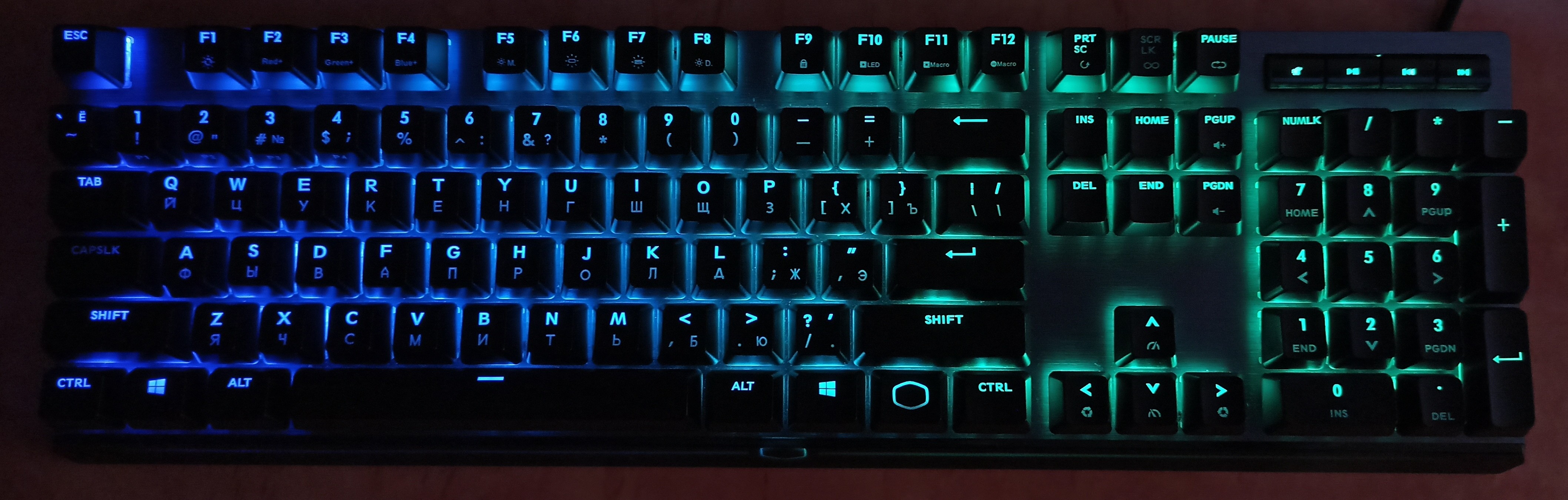 Не урезанная, цифровая панель на месте ( не всем нужно ); Cherry MX говорят оригинальные ( но кто их знает=) ); Цвета меняются достаточно гибко, 9 уровней интенсивности цвета; Подставка для рук на магните без защёлок, иск-кожа, на ощупь как мягкая резина, форму держит, но на ней лично у меня потеют ладони; Отсоединяемый кабель в оплётке, под него есть каналы вывода на центр и левоправо; Много предустановленных визуальных профилей ( "дыхание", "дождь" и Серьёзно? Игра в змейку? =) ) + 4 настраиваемых пользовательских профиля с возможностью импортаэкспорта; Возможность управлять настройками клавиатуры без установки софта, но софт есть и как по мне он ускоряет настройку; Макросы, но со своими нюансами (не Чапаевскими); Медиа-панель в правом верхнем углу, мелочь, а приятно; Корпус целостный, без заусенцев и люфтов, при нажатии клавиш, ударов о корпус нет, они до него не достают; Фиксируется чётко, не гуляет, выдвинутые ножки прорезинены, в сложенном виде выступают как прорезиненные накладки; Управление громкостью кстати на кнопках - PGUP PGDN... ГЛАВНЫЙ МИНУС - КТО ДОДУМАЛСЯ СДЕЛАТЬ CAPS LOCK, NUM LOCK и SCROLL LOCK привязанными к состоянию вкл и выкл? Кто в здравом уме будет постоянно сидеть с включенным капсом? А если выключаешь, то и подсветки нет... совсем, никакой. И эту проблему не решить, никак, а жаль.