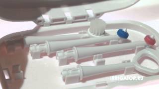 Предусмотрено плавное бесступенчатое регулирования давления подачи воды (до 7,9 атм или 800 кПа) и два режима работы: струя или спрей. Емкости для воды объемом 500 мл достаточно для одной полной процедуры. В комплект поставки входят четыре насадки (две стандартных с цветными метками для разных пользователей, одна насадка для чистки языка и внутренней поверхности щек и одна насадка-щетка). Ирригатор имеет крепление на стену, он прост, надежен и удобен при ежедневном использовании.