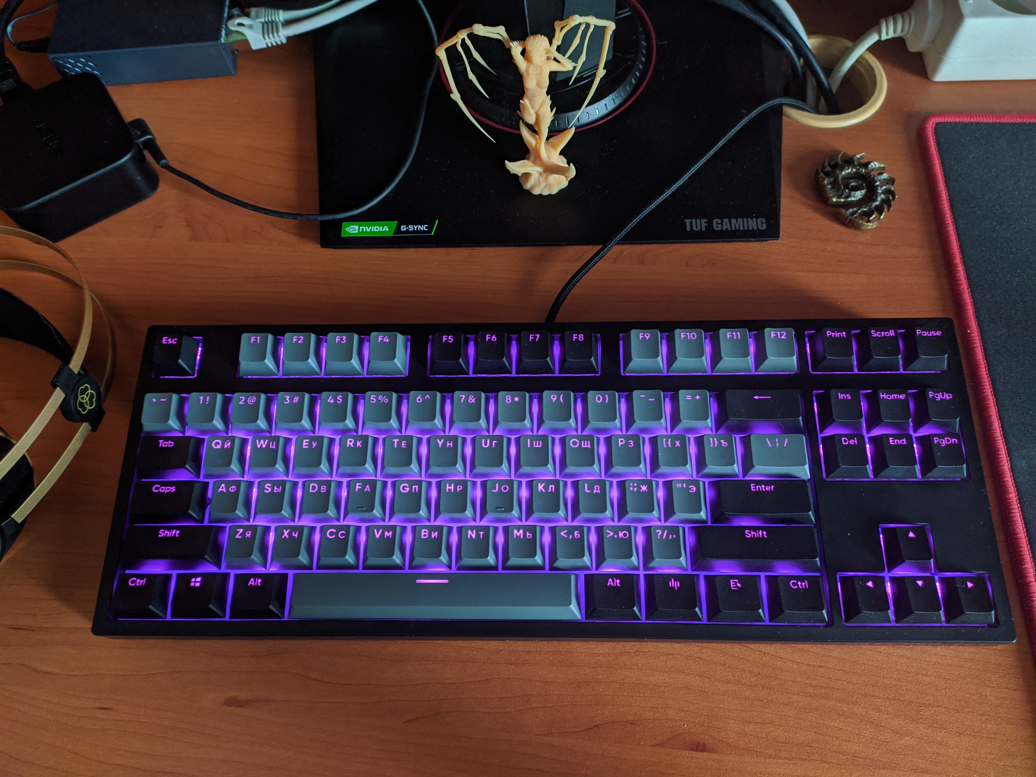 Долго искал клавиатуру и наткнулся на эту. На ней линейные Teal переключатели. К сожалению, ничего про них не нашел, но по ощущениям это Red, но чуть более тугие. У клавиатуры присутствует писк при включенной подсветке (узнал о нем, лишь когда поднес ухо к клавиатуре). Но можете не беспокоиться, он слышен только если ухо вплотную поднести. И то, думал, а не часы ли это мои, так как очень тихий писк. в обычном же положении, а уж тем более в наушниках не заметите даже. До этого была клавиатура с подставкой, сейчас непривычно. По слепой печати привык за минут 30 работы. Клавиши тут прекрасные. Толстый пластик, изготовленный по технологии двойного литья. Он шершавый и это нормально. Не думаю, что вечные клавиши, но надеюсь, лет за 10 не будут протерты до прозрачного слоя. Стабилизаторы отлично смазаны. И да, если плохо ходят длинные клавиши, не беспокойтесь, это свойство данной смазки. пройдет со временем. Но и без того прекрасно нажимаются. Клавиатура с Hot Swap. Без пайки любой сможет вытаскивать и заменять переключатели. Клавиатура тяжелая и очень хорошо стоит на столе. Очень жесткая конструкция. Софт приятен. В целом очень доволен покупкой. За такие деньги ничего и близко хорошего нет. Рекомендую к приобретению. PBT Doubleshot. Hot Swap. Отличный вариант для доработки. См. комментарий. ![]() |