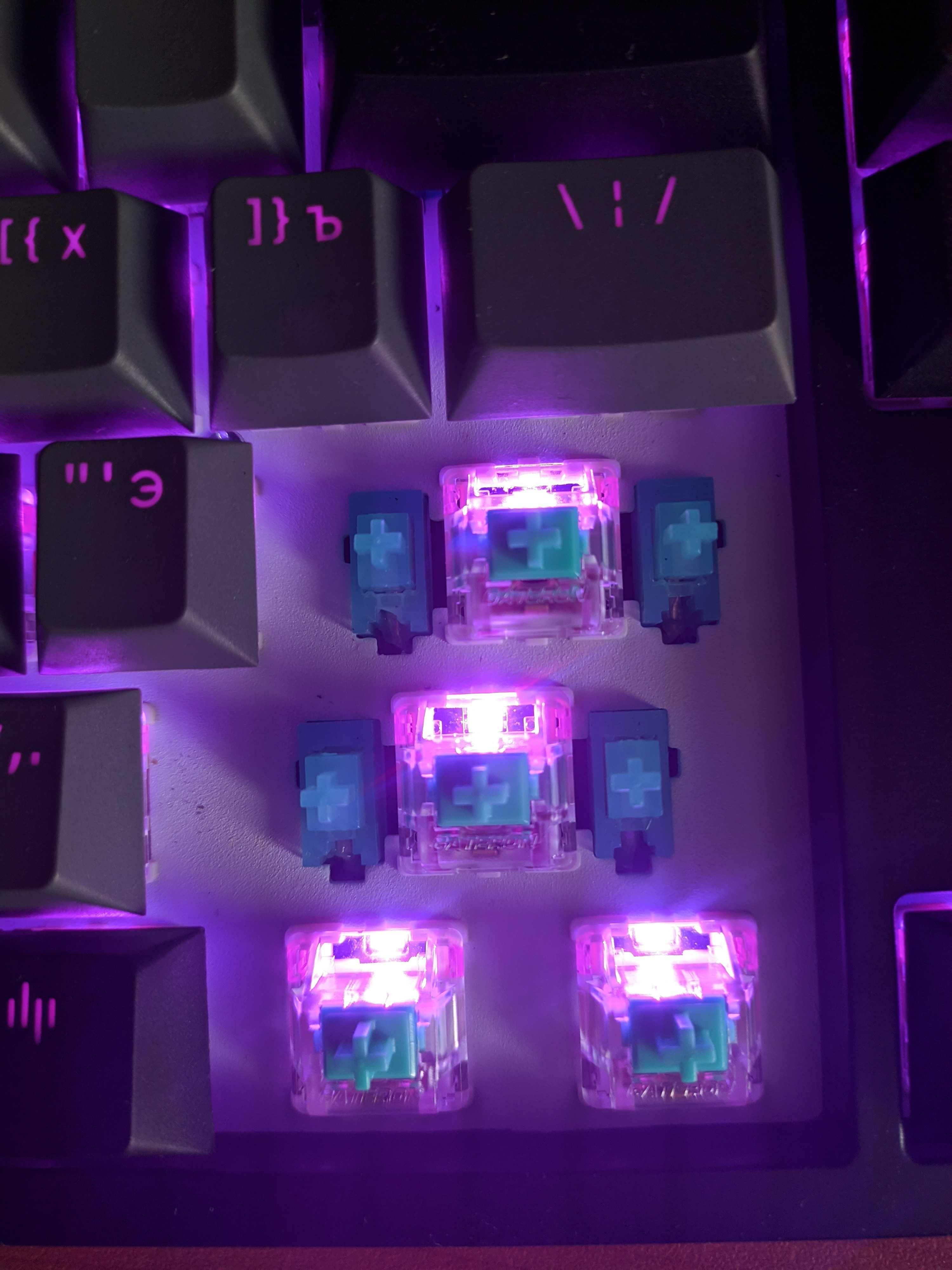 На ней линейные Teal переключатели. К сожалению, ничего про них не нашел, но по ощущениям это Red, но чуть более тугие. У клавиатуры присутствует писк при включенной подсветке (узнал о нем, лишь когда поднес ухо к клавиатуре). Но можете не беспокоиться, он слышен только если ухо вплотную поднести. И то, думал, а не часы ли это мои, так как очень тихий писк. в обычном же положении, а уж тем более в наушниках не заметите даже. До этого была клавиатура с подставкой, сейчас непривычно. По слепой печати привык за минут 30 работы. Клавиши тут прекрасные. Толстый пластик, изготовленный по технологии двойного литья. Он шершавый и это нормально. Не думаю, что вечные клавиши, но надеюсь, лет за 10 не будут протерты до прозрачного слоя. Стабилизаторы отлично смазаны. И да, если плохо ходят длинные клавиши, не беспокойтесь, это свойство данной смазки. пройдет со временем. Но и без того прекрасно нажимаются. Клавиатура с Hot Swap. Без пайки любой сможет вытаскивать и заменять переключатели. Клавиатура тяжелая и очень хорошо стоит на столе. Очень жесткая конструкция. Софт приятен. В целом очень доволен покупкой. За такие деньги ничего и близко хорошего нет. Рекомендую к приобретению. Doubleshot PBT.