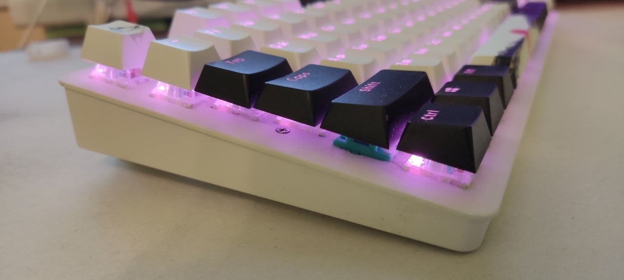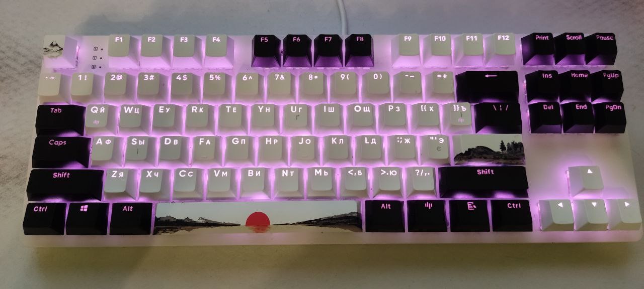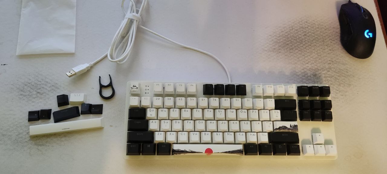 Из минусов - всё тот же мягкий тихий клик - первое время часто бывают случайные нажатия, просто не ощущаешь, что нажимаешь клавишу. Почему-то в черных кейкапах свет пробивается очень тускло, с белыми всё норм. Ну и размеры - честно говоря, могла быть более компактной.
