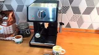 Рожковая кофеварка-эспрессо De'Longhi ECP 33.21.BK от известного итальянского производителя имеет угловатые формы черного пластикового корпуса с серебристыми металлическими поверхностями фасада, площадкой пассивного подогрева чашек и решеткой-подставкой каплесборника. Модель рассчитана на приготовление эспрессо и горячей воды для заваривания чая, а также ручного подогрева молока для латте макиато и взбивания молочной пенки для капучино. У прибора есть 2 режима работы, которые можно выставить поворотным регулятором: режим панарелло и режим приготовления кофе/подачи горячей воды. Эспрессо готовится обычным способом после предварительного прогрева бойлера (загорается зеленый индикатор «ОК»), а для работы с молоком нужно установить боковой рычажок на соответствующую метку. При этом через трубку капучинатора будет подаваться пар разной температуры для подогрева либо вспенивания молока.