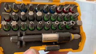 DeWalt опять выручает. Классный набор по отличной цене. Покупал за 750р. 32 предмета. Менее 25р за предмет. Отлично. Биты самые ходовые, самых ходовых размеров. Отличный держак. Кейс