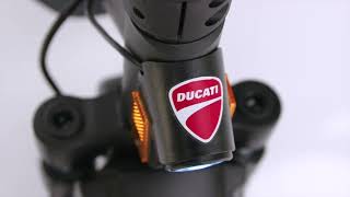 Электросамокат производителя Ducati — это решение на стыке среднего и продвинутого класса. Модель подходит не только для ровных городских покрытий, но и для бездорожья, ведь оснащена амортизацией спереди (вилка) и сзади, которая поможет устранять вибрации при попадании 10-дюймовых надувных колес на ямки и ухабы. Еще одной фишкой транспортного средства выступает рама из магниевого сплава, которая сочетает прочность и надежность стали с легкостью алюминия (общий вес кикскутера равен 16.7 кг).