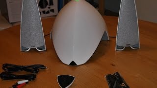 Большинство недорогих 2.1 систем внешне копируют привычные музыкальные центры так как по сути пришли им на смену. Вот вам 2 небольших квадратных колонки, и вот еще одна такая же, но побольше. И тем необычнее на этом фоне выглядит комплект Prisma Encore от Edifier, который в плане дизайна скорее вдохновлен космическими кораблями из фантастических фильмов. Только посмотрите на этот сабвуфер — он точно будет первым, на что люди будут смотреть, входя в комнату. Да и сателлиты в виде пирамид недалеко ушли.