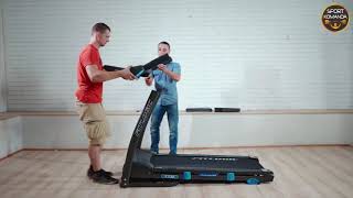 Плюс имеются и компенсаторы неровностей, что позволяет размещать модель на разных полах. Отдельного упоминания заслуживают наличие динамиков, держателя для бутылки и практичных органов управления с кнопками на рукоятках и обилием опций, включая доступ к 64 тренировочным программам. На дисплей выводятся различные сведения, включая текущую скорость и угол наклона полотна, расход калорий и показатели ЧСС.