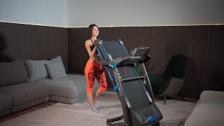 Максимальная скорость составляет 16 км/ч, но если этого мало, то для повышения интенсивности тренировочного процесса имеется электронная многоуровневая регулировка угла наклона (до 15%). Беговая дорожка FitLogic T33 предусматривает складную конструкцию — полотно поднимается, что дает возможность при хранении уменьшить прежде всего занимаемые габариты в длину. Для перемещений по квартире предложены специальные ролики, ведь вес тренажера приближается к 60 кг.