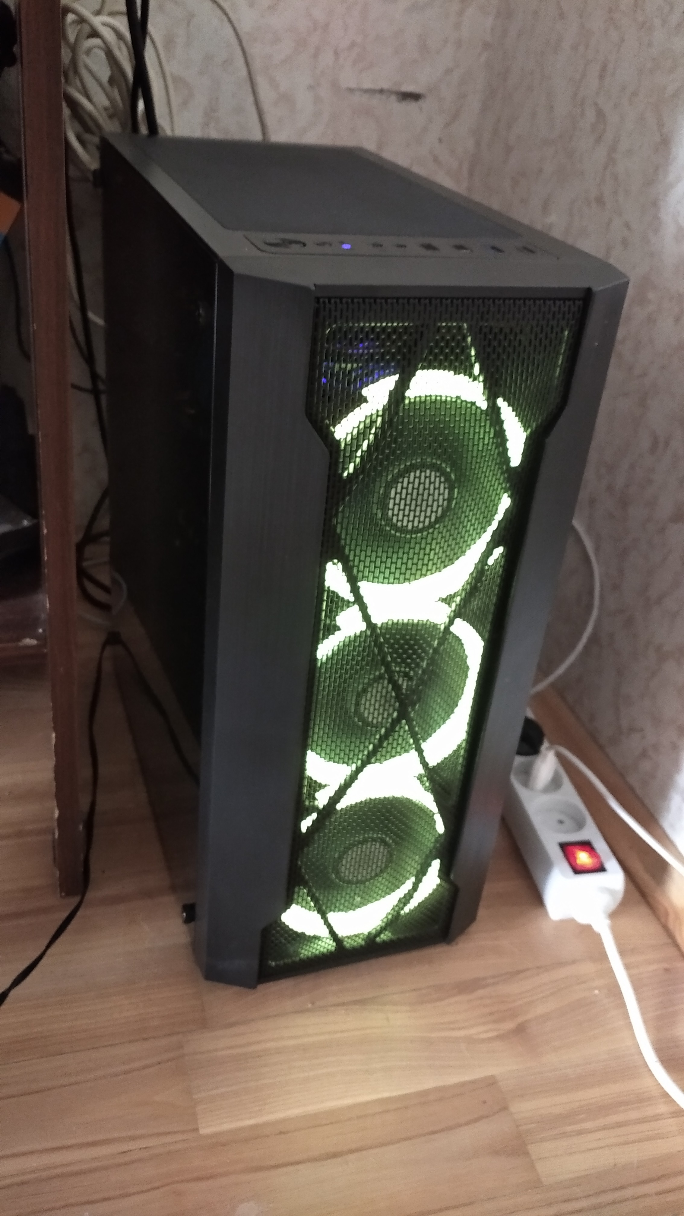 В комплекте только три передних вентилятора. остальные 3 придется докупать. подсветка не соответствует действительности. сами лопасти не светятся, только круг вокруг лопастей горит зеленым. цвет поменять нельзя. к стеклу претензий, пока, не имею. в принципе хороший обдув, компактный корпус, в который может влезть Standart ATX. более менее хороший кабель-менеджмент устроить можно, только не прикручивайте сразу блок питания, а то он закроет одно отверстие. довольно длинные провода передней панели, можно протянуть с наружи корпуса.сеточка от пыли для верхних вентиляторов и для вентилятора БП, которая довольно уверенно держится на магнитиках)) 1. место только для двух HDD, может конечно для кого-то это не минус, вот только прикрутить их придется постараться ведь для этого нужно открутить подставку для HDD, что бы закрепить диск. 2. нельзя поменять подсветку. 3. отдельный чип для подключения передних вентиляторов это хорошо, вот только он не прикручивается, а приклеивается. хз сколько этот стандартный клей протянет. сам чип питается через тот же разъемом, что и HDD, но это минусом не назову)) 4. и опять же. не меняется подсветка. взял корпус, думал как на картинке будет. хотя, что я мог ожидать за 3500. ))) |