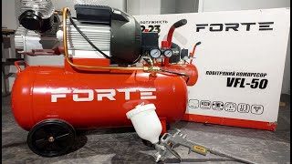 Аппарат для производства сжатого воздуха с приличной (по меркам бюджетных «гаражных» компрессоров) производительностью — 420 л/мин (на входе). На нем установлены мотор мощностью 2.2 кВт и V-образная двухцилиндровая головка, благодаря которым компрессор Forte VFL-50 быстро наполняет сжатым воздухом 50-литровый ресивер и оперативно докачивает его по мере необходимости. На выходе из ресивера установлены реле (с пределом срабатывания на значении в 8 бар), два манометра и воздушный редуктор, позволяющий регулировать давление на выходе. Аппарат имеет вес 38 кг и снабжен колесной базой, обеспечивающей удобную транспортировку оборудования в пределах помещения. Колеса и передняя опора прорезинены, чтобы компрессор не дребезжал и не подпрыгивал от вибрации во время работы.