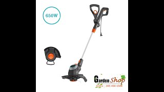 Мощность электромотора, установленного на триммере GARDENA PowerCut 650/28 9874-20, составляет 650 Вт (это одна из самых мощных моделей в линейке триммеров Gardena). Такого значения не хватит для профессионального использования на больших травяных полях, но вполне достаточно для того, чтобы уверенно косить любую траву на даче или приусадебном участке: молодую, сочную или сухую. За один проход инструмент скашивает полосу шириной 28 см. По мере износа лески ее можно «выпускать» из катушки, на которую намотано 6 метров жилки, путем «постукивания» триммерной головкой о землю.