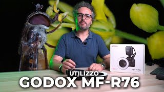 Кольцевая макровспышка, которую можно цеплять на переднюю оправу объективов. Для этого служит набор переходных колец под распространённые диаметры передней линзы: 49 / 52 / 55 / 58 / 62 / 67 / 72 / 77 мм. Блок управления при этом устанавливается на горячий башмак камеры. С источником кольцевого света он соединяется пружинным кабелем. Godox Ring MF-R76 обладает ведущим числом 14, её мощность можно настраивать в пределах от 1/1 до 1/128 с шагом в ±1/3 EV.
