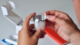 Внешне Buds A остались практически такими же, как и их предшественники, похожими на улитку. А вот расцветок теперь стало не 4, а две, причем не самых привлекательных: белая и оливковая. Овальный кейс снаружи только белый и лишь внутри выполнен в цвет наушников. Снизу на корпусе находится кнопка соединения с источником, недалеко – разъем для зарядки USB C и светодиодный индикатор статуса заряда.
