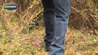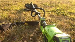 Аккумуляторный триммер с современным бесщеточным мотором, обеспечивающим продуктивную работу во время кошения травы и удаления зарослей на приусадебном участке. Инструмент имеет прямую штангу и D-образную рукоятку. Штангу можно разобрать на две части, чтобы сложенное устройство занимало меньше места при хранении на полке или во время перевозки в багажнике автомобиля. У триммера Greenworks GD40BC 2100207 есть две рабочие насадки: косильная головка (ширина захвата 36 см, диаметр лески 2 мм) для кошения травы и стальной нож для срезания растительности с толстыми стеблями. В комплект входит ремень для подвешивания инструмента на плечо. Триммер поставляется без аккумулятора и зарядного устройства. Для питания устройства можно использовать любую батарею Greenworks из «семейства» G-MAX 40V.