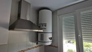 Инновационный энергоэффективный итальянский электрический накопительный водонагреватель объемом 80 л, цифровой системой управления, качественной пенополиуретановой теплоизоляцией и встроенным тепловым насосом, существенно снижающим удельные затраты электроэнергии на подогрев. В нижней части корпуса аппарата расположен вентилятор и компрессор с испарителем. Над ними находится внутренний стальной бак, со встроенным спиральным теплообменником – «змеевиком» конденсатора.