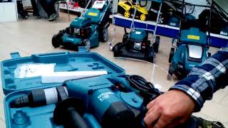 Скорость вращения патрона настраивается с помощью регулятора оборотов (до 800 об/мин). Инструмент продается в комплекте с набором оснастки (3 бура разных размеров, пика и долото), пыльником, дополнительной (передней) рукояткой, ограничителем для сверления отверстий определенной глубины и пластиковым кейсом, предназначенным для хранения и переноски перфоратора со всеми принадлежностями.