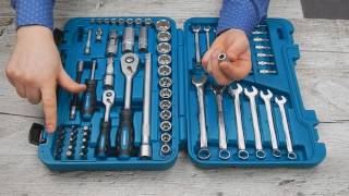 Набор Hyundai K 70 состоит из инструментов, приспособлений и аксессуаров, предназначенных для работы с крепежом. Внутри кейса находятся 9 комбинированных гаечных ключей, 20 торцевых головок разного размера и пара специальных головок для выкручивания свечей. Интересно отметить, что все торцевые головки в данном наборе имеют внутренний профиль Surface. Такие насадки намного лучше, чем обычные, подходят для работы с болтами и гайками, у которых «слизаны» грани. Для вращения головок можно использовать трещотки разных размеров (в комплекте их две). В наборе также есть пара карданов и сразу четыре разных удлинителя (три жестких и один гибкий) — такие аксессуары нужны, чтобы крутить крепеж в местах с неудобным доступом. А для винтов и саморезов в комплекте есть целых 29 бит и отверточная рукоятка для работы с ними.
