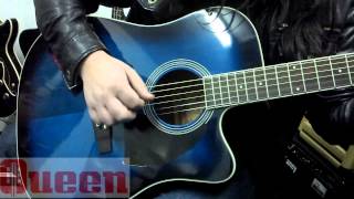 Пластиковая защитная накладка (пикгард) надежно защищает нижнюю часть корпуса под розеткой от повреждений и потертостей, оставляемых рукой или медиатором. Окантовка корпуса выполнена под слоновую кость. Гриф традиционно кленовый с палисандровой накладкой и маркерами ладов в виде точек.
