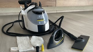 Достаточно продвинутый бытовой пароочиститель от известной немецкой компании Karcher. Модель принадлежит к высшему ценовому сегменту, но при этом может похвастаться хорошей мощностью, широким функционалом и практически полностью способна заменить химчистку в домашних условиях. Мощность потребления составляет 2200 Вт, при этом техника защищена от перегрева — при критическом повышении температуры срабатывает автоотключение.