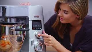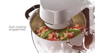 Прибор, представляющий флагманскую линейку кухонных машин британского бренда Kenwood, позволяет не только измельчать или смешивать продукты, но и сразу готовить их в той же металлической чаше, рассчитанной на 6.7 литра. Для этих целей модель предусматривает нагреватель с термостатом, электронную систему управления с информативным дисплеем, таймером и 24 автоматическими программами.