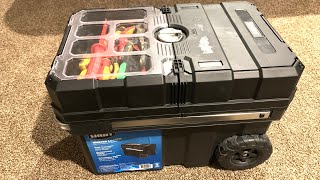 Системы хранения инструментов — это «конек» израильской фирмы Keter. Она выпускает такую продукцию не только под своей торговой маркой, но и «на сторону» (по заказам таких производителей, как NEO, Hart и др.). Инструментальный ящик Keter Master Pro Sliding — один из наиболее вместительных контейнеров в ее ассортименте. Его габариты равны 616x378x415 мм, общий объем — 65.3 литра. Поскольку ящик тяжелый (даже в пустом состоянии он весит 7 кг), то у него есть транспортные колеса и длинная выдвижная ручка, за которую его можно таскать, словно туристический чемодан. Колеса большие (удобно преодолевать пороги) и обрезиненные (не оставляют царапины даже на паркете или ламинате).