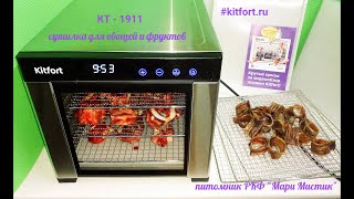 Электрическая сушилка торговой марки KITFORT относится к продвинутым решениям. Модель получила стильный корпус из металла, а дополнительную эргономичность тут обеспечивают ручки для переноски по бокам, а также наличие стеклянного окошка на дверце, которое позволяет следить за процессом высушивания, не открывая ее и не нарушая температуру внутри камеры. Сушилка фруктов KITFORT KT-1911 предусматривает расширенный комплект поставки: шестерку стандартных поддонов из хромированной нержавейки, дополняет 6 лотков для пастилы, а также 6 сеток, предназначенных для высушивания мелких продуктов.