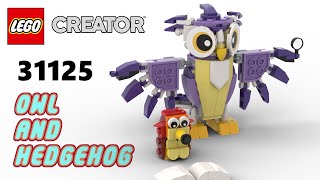 Сравнительно несложный и доступный блочный детский конструктор «Удивительные лесные обитатели» 3-в-1, из которого можно собрать три различных модели. Первая сборка — мудрая сова с ежиком. Символ мудрости и одна из главных птиц в сказочном лесу имеет сиреневое оперение и желтую грудку из деталек. Узнать в ней сову помогут большие желтые глаза и характерный клюв. Она имеет вращающуюся голову, а также подвижные хвост, ноги, крылья и некоторые перья.